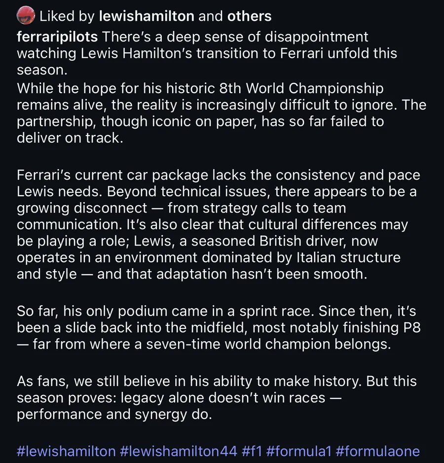 Le fameux “like”, bien que furtif, illustre ce malaise : « Sur le papier, le duo Hamilton-Ferrari fait rêver. Mais dans les faits, la synergie n’y est pas, la monoplace reste instable, et la communication bancale. » Ce simple clic, bien que retiré, justifie les spéculations sur son intégration difficile.