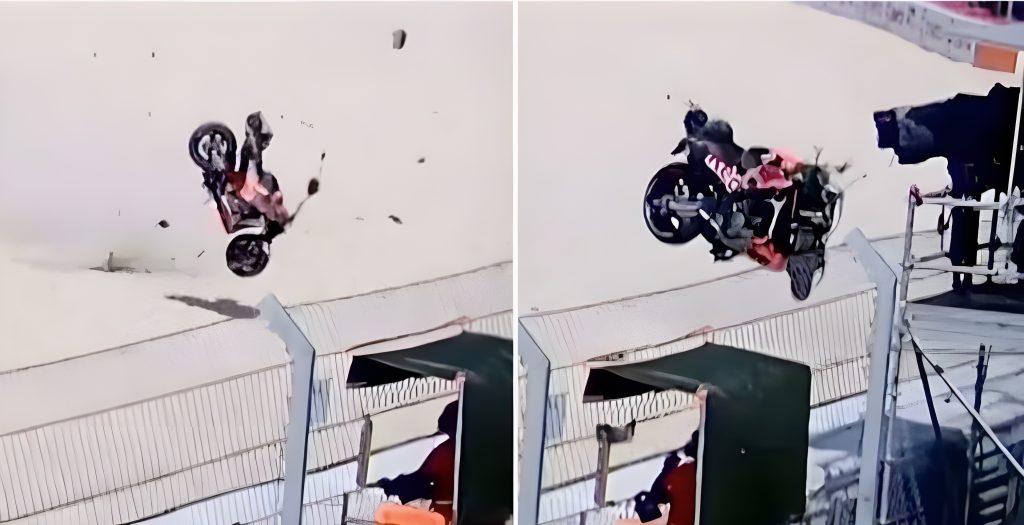 Après avoir traversé le bac à gravier, sa moto, transformée en projectile incontrôlable, a littéralement décollé, voltigeant par-dessus les barrières de sécurité pour venir heurter de plein fouet une caméra de télévision. Juste derrière, son opérateur. Miraculeusement, le cadreur est indemne, la moto ayant rebondi sur la barrière après l’impact avec son matériel.