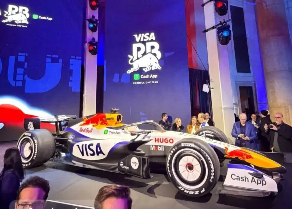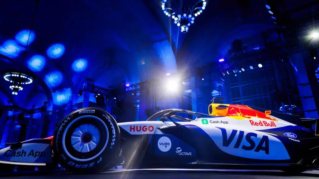 Visuellement, la monoplace adopte une base blanc perlé nettement plus dominante qu’auparavant, immédiatement contrastée par des touches bleu profond et noir carbone sur les flancs et les éléments aérodynamiques. Le logo Visa s’impose comme point focal sur les pontons, tandis que Cash App conserve une présence massive à l’avant et sur les surfaces latérales, confirmant le poids commercial du partenariat titre.